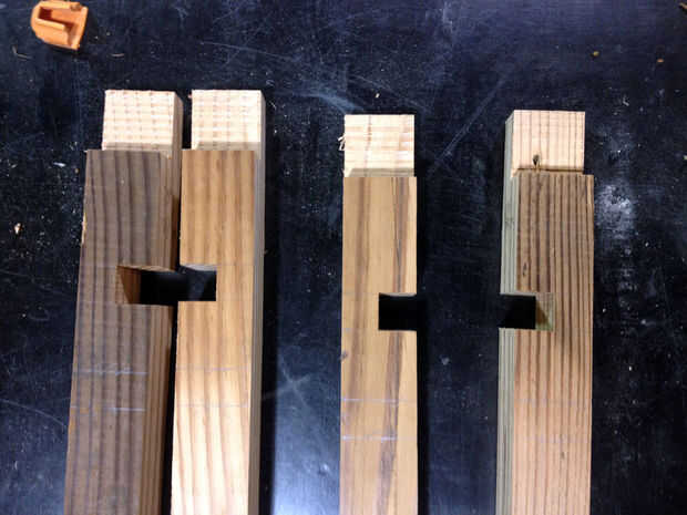 En el 36" espacios en blanco, midiendo desde la parte superior hacia abajo, las mortajas desde 4", 18-1/2" y 29-1/4". El 31-1/2" espacios en blanco, midiendo desde la parte superior hacia abajo, comienzan las mortajas en 4" y 18-1/2". Uso la Sierra de mesa con una mitra calibre o Cruz corte trineo para cortar las ranuras 3/4" de ancho y 3/4"-profundo.