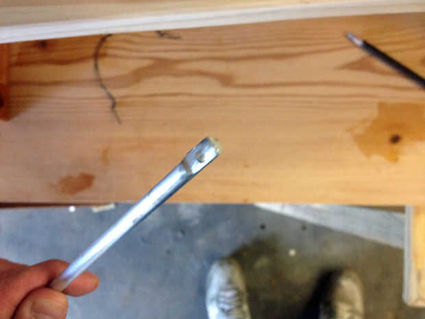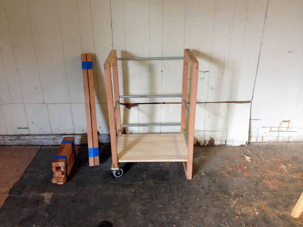Mucho como las escalera de dos marcos, el carro todo confluye a la vez. Antes del montaje, medida de 3" por encima de las ranuras en cada lado del chasis, en la cara perpendicular a donde ya están sentados los tubos galvanizados. Perfore un agujero de 3/8" de profundidad con una pala de 3/4" o pieza Forstner de aceptar los rieles traseros.