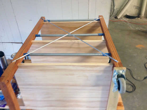 Ahora debe tener un objeto con aspecto de coche de barra, pero probablemente será un poco lateralmente inseguro ya que se compone de una serie de paralelogramos. Apoyo de los laterales con un X-brace de barra de aluminio de 3/8" o similares. Moler un poco plana punto en cada extremo, taladre un orificio guía y asegure al marco. Medir las diagonales (deben ser iguales) en la parte posterior para asegurarse de que el marco es cuadrado. Una vez el X-brace, todo el conjunto debe endurecer hasta muy bien.