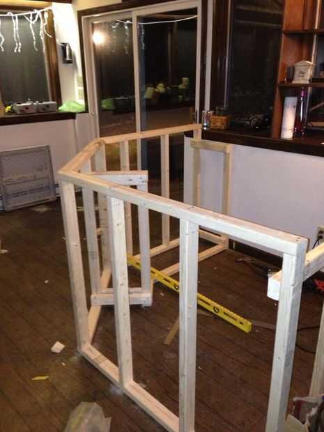A continuación construí los soportes verticales de contador inferiores con 2 x 3 y son 36" de alto por 15.5" amplia pero para personalizar esas dimensiones también. Entonces clavó los soportes en los postes de la pared.