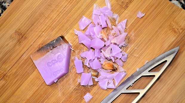 En la tabla de cortar, cortar el jabón de barra (s) en trozos pequeños usando el cuchillo. Los más pequeños los trozos más rápido el jabón se derretirá con la introducción de agua hirviendo.