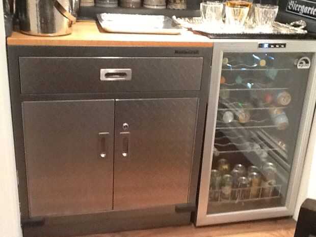 Podría construir sus propio bar armarios pero aprendí hace mucho tiempo que usted puede comprar más barato que usted puede hacer cosas realmente interesantes. Se puede modificar para que quepa. Desde que tuve una nevera de bar estándar 19" necesitaba un gabinete que llenaría los restantes 29" apertura. 28" derribar armario garaje que vino con una tapa de arce barnizado encajan perfectamente. También tenía el aspecto industrial iba y emparejado de la nevera.