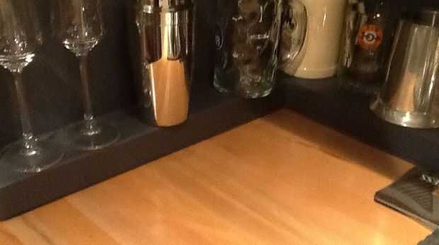 Desde el bar ni nevera ni el gabinete inferior era tan profunda como el armario decidí un estante sería la mejor manera de ocultar la diferencia. También proporciona almacenamiento para los vidrios, etc. y evita cosas rodando en el espacio vacío. He usado claro pino 2 x 6. Me dejó todo el ancho en la parte de atrás y arrancó a unos 3" a los lados para maximizar de la barra superior.