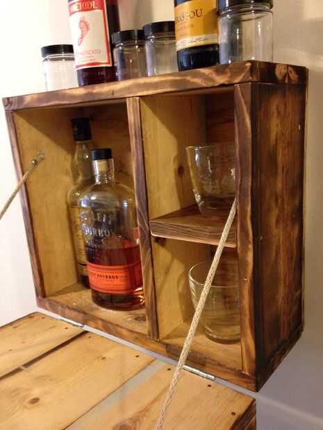 Para materiales, usé Pino 1 x 6. Los lados y el divisor central se redujeron a 12" de longitud. La parte inferior y superior se redujeron a 16" de longitud. Y el estante se redujo a 4". Usé algunos agujeros para sostener todo junto y 6 5" tornillos de 3" tornillos para montar a la pared. El pestillo que mantiene la tapa cerrada se forma de un viejo gancho de metal y algunos tornillos de 1/2". Después de la cuerda que sostiene el nivel de la tapa para la zona de mezcla "bar", puede utilizar cualquier cuerda o cintas que tienes ahí.