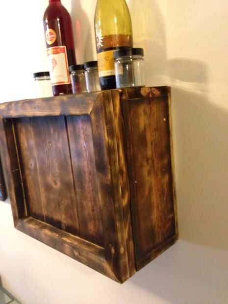 Montaje es sencillo. Para el forro, he utilizado madera contrachapada de 3/8". Y para el adorno en el frente, algunos extremos de 2 x 4 que tuve puesta alrededor. Luego para acabar, usa mapa gas a quemar, quemar más pesadamente a lo largo de los bordes para darle cierta profundidad. Tiempo de construcción total para mí usando una sierra de mesa y Sierra de inglete compuesto fue de 2 1/2 horas.