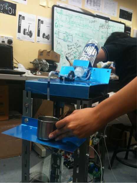 La imagen adjuntada es nuestro dispensador de bebidas. Cuando se activa el interruptor situado en la base, el servo se mueve y baja la tubería plástica, permitiendo que la bebida a dispensar.