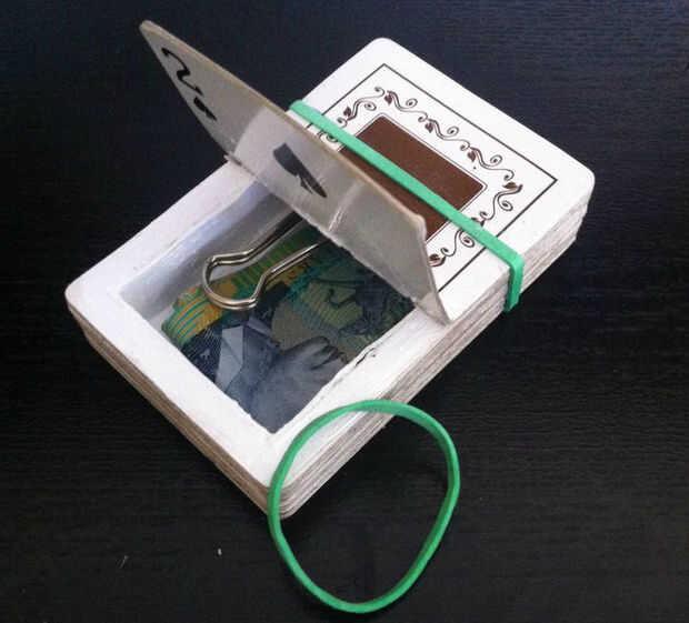 se cansó de esconder mi dinero dentro de un libro (sólo empujó en las páginas, no se convirtió en una diversión seguras) y fue en busca de una manera más creativa para ocultarla. VI este video de youtubey pensé que una baraja de cartas es la trampa p
