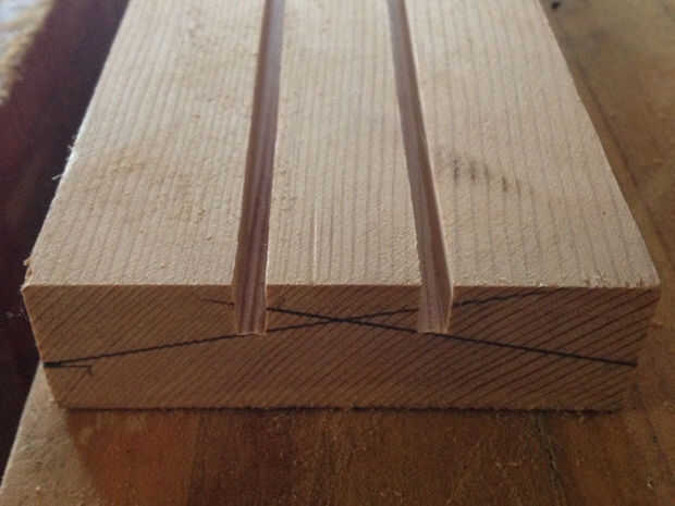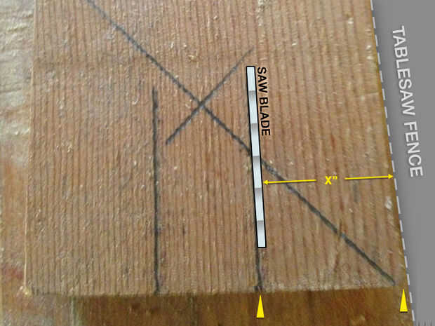 Conjunto de la Sierra de mesa cerca para que la hoja corta en el exterior de la tira de 3/4" ha marcado anteriormente. Hacer un corte, vuelta el tablero y hacer el corte a lo largo del otro lado de la tira de centro. Si se establece correctamente la profundidad de la cuchilla, los fondos de los cortes deben tocar sólo las marcas de ángulo realizadas. Repetir los cortes en sus tablas.