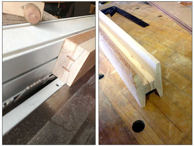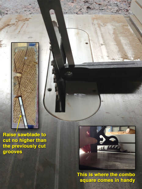 Utilice el bisel T deslizante para establecer el ángulo de la hoja de sierra para que coincida con las marcas de ángulo. Ajuste la profundidad de la cuchilla para que corte no superior a la ranura que recortamos anteriormente para la tira de montaje.
