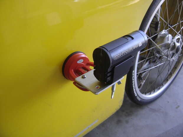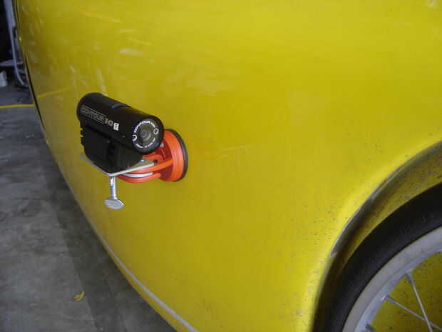 Otra vez, no tengo un cordón conectado, pero no hay manera voy a perder riesgo mi cámara y mi cámara de cinco o diez dólares montar a un bulto duro. Creo que la parte más delicada va determinar el mejor lugar para colocar el otro extremo de la cuerda.  Desde mi velomobile está compuesto por superficies duras, planas, no porosas, tengo gran flexibilidad en mis cámaras de montaje.  Yo te tiro, literalmente, para los ángulos de "Top Gear" de las ruedas girando, haciendo vueltas, tomar curvas rápidas, tal vez un duro golpear ahora y después, pero no intencionalmente!