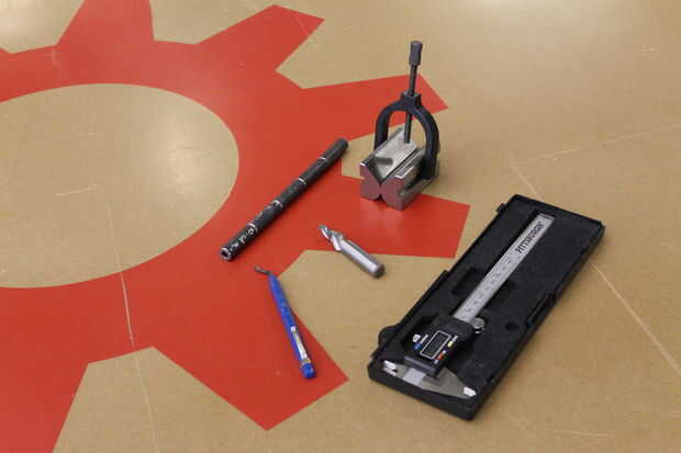 Este es un método rápido para hacer una pequeña herramienta que te permite encontrar los centros de los objetos de forma circular, como los discos o los extremos de objetos cilíndricos. Colocarlo en el borde de un objeto redondo para que los pernos p