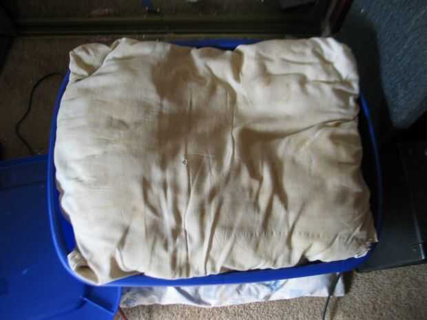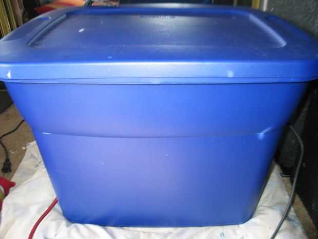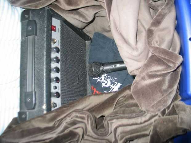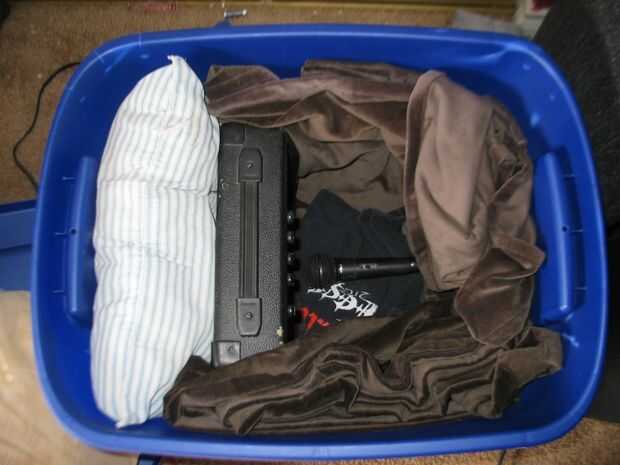 Materiales que necesitará: un recipiente de mediano o grande de plástico con tapa; una pequeña práctica amp o extensión altavoz-(un altavoz de 8" para mi proyecto, pero esto puede sustituirse con un 10 o 12 pulgadas si tienes un recipiente lo suficientemente grande; viejas almohadas o mantas; un micrófono con cable, cable del altavoz con un 1/4" enchufe por un lado y los conectores hembra de horquilla en el otro.