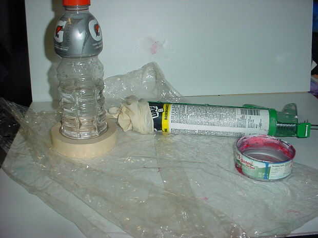 La va a necesitar una pequeña cantidad de materiales, un tubo de masilla de látex acrílico y una pistola de calafateo sería bueno, cinta, celofán u otro plástico rígido semi, estoy usando la envoltura del prestreched artista lienzo (reciclar, reutilizar) agua y envase