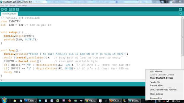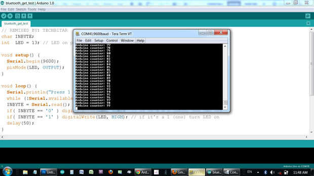 Si han subido el bosquejo de la prueba de obtener, escriba 1 (uno) o 0 (cero) para activar pin 13 condujo en el Arduino, encendido o apagado. Si subiste el bosquejo de la prueba de envío, usted verá una lista creciente de ascendente de números en la pantalla de Tera término enviada de Arduino a través de Bluetooth de serie.