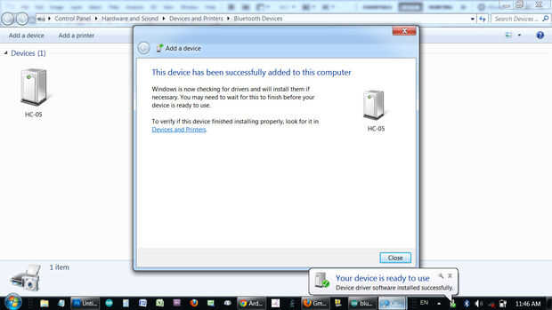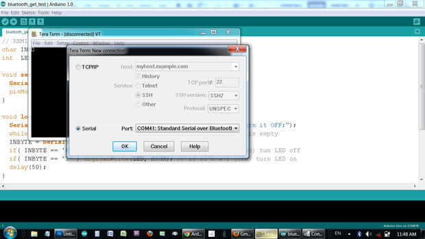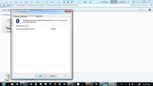 Ahora, Bluetooth de la PC y el Arduino Bluetooth están conectados por cable serial.