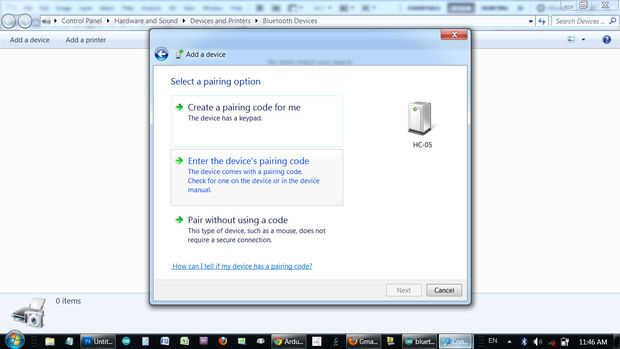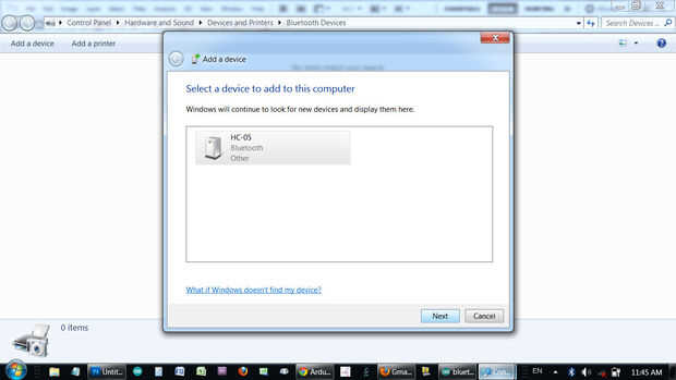 Si el transceptor serie de Arduino Bluetooth está conectado correctamente, debería aparecer su nombre de dispositivo en la lista. Haga clic en él y haga clic en siguiente.