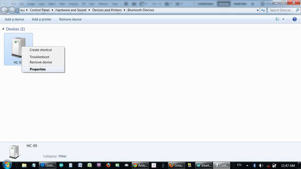 Haga clic derecho sobre el dispositivo Bluetooth y seleccione "Propiedades".