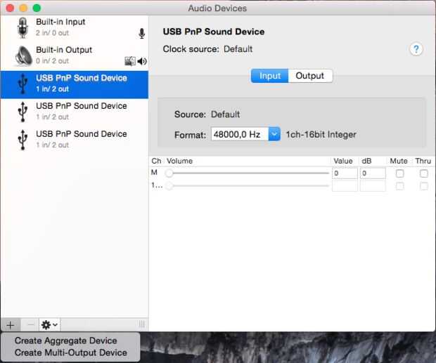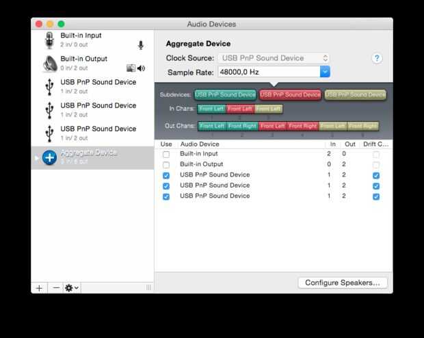 Para hacer esto que tienes que abrir una aplicación llamada Audio MIDI setup, se encuentra en utilidades. Con este programa es posible combinar cualquier número de dispositivos de sonido conectados a una virtual.