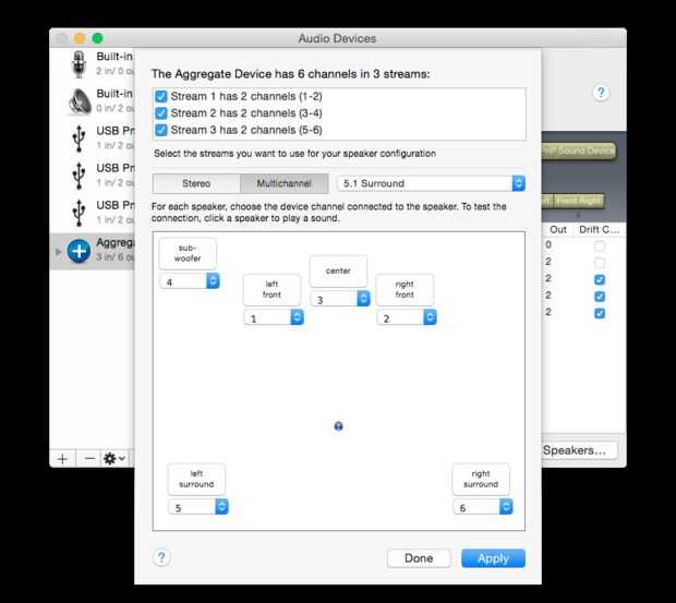 3) Seleccione el dispositivo agregado y marque las casillas de las tres tarjetas de sonido. También puede cambiar la frecuencia de muestreo, el volumen relativo, el dispositivo de reloj maestro y si deriva del control que se activará. (Google para obtener más información, o simplemente prueba los diferentes ajustes)