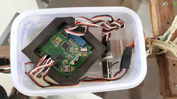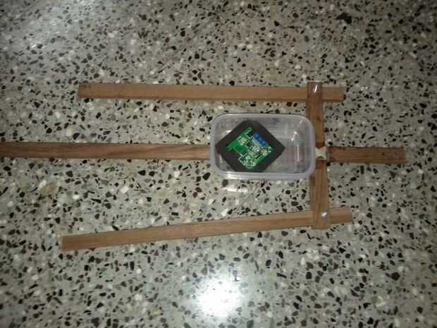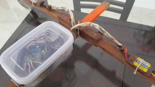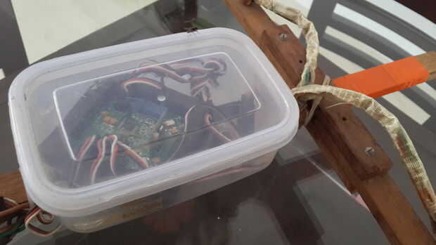 Utiliza una caja de almuerzo plástica para proteger el tablero de regulador del vuelo (tablero original de KK) y el receptor. Utilice un soldador para derretir los agujeros en el plástico y ataduras de cremallera para fijarlo a la estructura. Ponga la caja cerca de la T común como sea posible. Balanceamos el helicóptero de T por el contrapeso de la batería Lipo.