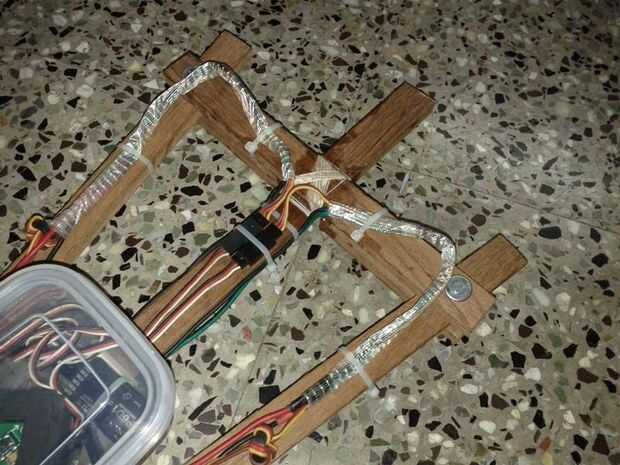 Construir un barato Tri-helicóptero de multi-rotor uso madera, abrazaderas de plástico y 8 tornillos!Estoy usando este tri-helicóptero para probar controladores de servo. Allí fueron unos desafíos para salir de esta tierra y esperemos que esto ayuda