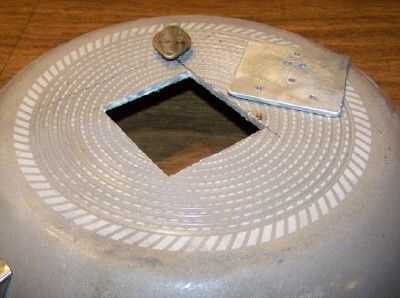 Si yo hubiera sido capaz de conseguir un LM350 en una caja TO-220, el disipador de calor hubiera sido un simple pedazo de aluminio de calibre 20. Sin embargo, corté un disipador de calor de la parte inferior de una vieja sartén de aluminio. Aquí puedes ver todos los agujeros perforados para el caso de la a-3 del LM350. He utilizado un patrón de papel para marcar la posición de los agujeros. Primero empujé el pin ADJ y en a través del papel. Luego dio la vuelta el LM350 y había marcado el centro de los agujeros en el papel. Los dos agujeros en el borde inferior del disipador de calor son para que tornillos para montarlo en la base de madera. Encontré un pequeño tubo de grasa térmica en mi caja de chatarra piezas y algunos entre el disipador de calor y la superficie de los LM350 había manchada.