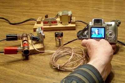 (Una reiterada ADVERTENCIA: antes de conectar el adaptador de alimentación a la cámara, compruebe el voltaje de salida real a la clavija de red. [Meter un alfiler común o el cable de alambre fino de una resistencia en el centro de la clavija para obtener un punto de conexión buena.]