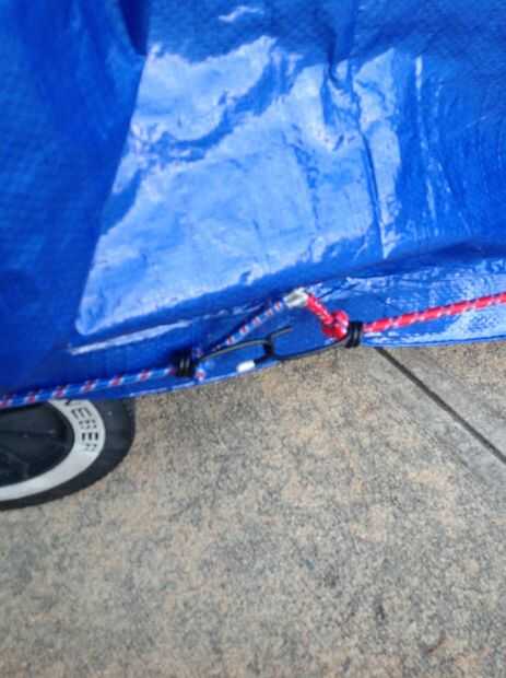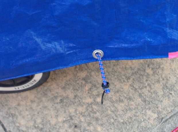 Mi vieja cubierta tenía Velcro, pero consiguió interrumpida y frágil. Podría como fijar bien esta demasiado sólo abrir uno de los extremos del bungee, hilo de rosca a través de las arandelas de metal y ate los extremos.