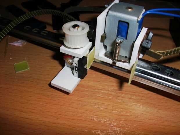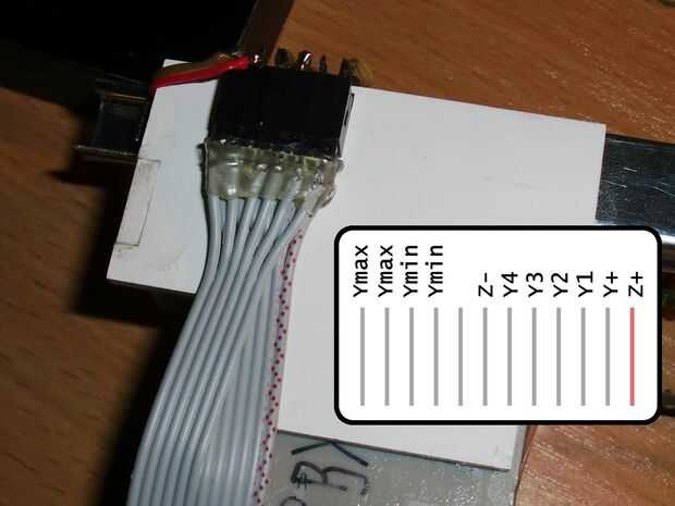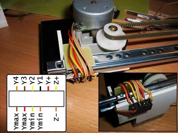 En la siguiente foto hay una descripción y los colores de los cables. Hay cables de motor paso a paso (Y + Y1, Y2, Y3, Y4), los cables del electroimán (Z +, Z-) y el límite cambia cables (2 x Ymin, 2 x Ymax). YMIN es un interruptor cerca del motor.