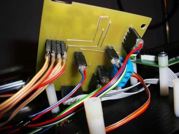 En la segunda foto que se puede ver un "puente" hecho de laminado - se hace porque el regulador puede atrapar en los cables. También hay dos resistencias de 15 ohms 5W soldadas en serie con las bobinas del motor de pasos de X. Tuve que bajar la corriente del motor, pero más tarde que pasé estas resistencias (que se muestra en las dos últimas fotos). Sólo tiene que conectar cada toma goldpin como presentado arriba.