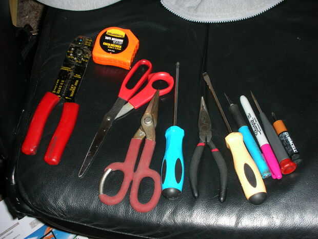 Taladro de mano, 3/8" o mayor tirada. 1/8" acero-corte del pedacito de taladro 3/32" corte de acero del pedacito de taladro #4-40 SAE Tap #1 destornillador Philips #2 destornillador Philips Pinzas de punta de aguja Cortador de tubos Tijeras para chapa