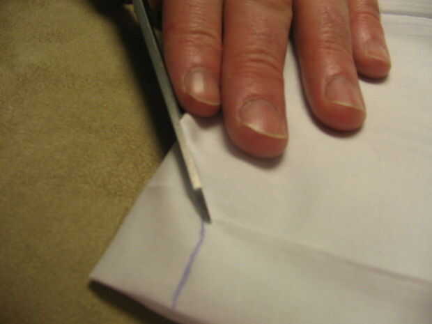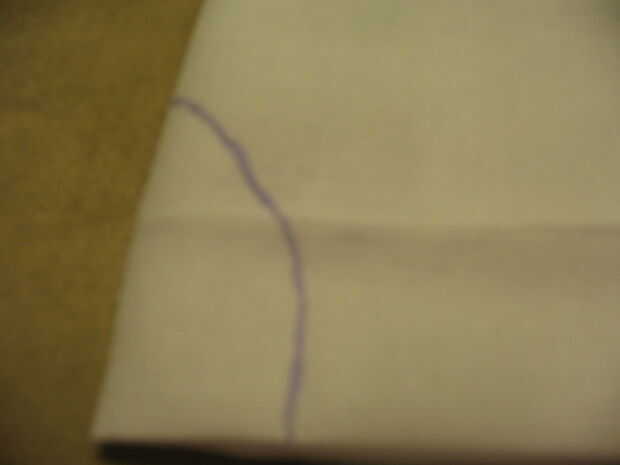 Paso 4: Antes de hacer este paso, por favor lea y práctica utilizando papel doblado como su material. ¿Por qué? Porque usted será capaz de decir lo que forma tu cuello será y porque tiene que ver que mientras que la marca parece que está haciendo un pequeño agujero, realmente hace un agujero mucho más grande que piensas que será una vez que está desplegado. Una vez han practicado con el papel. Marque la línea de corte en la esquina que es todo pliegues, sin bordes abiertos. Por favor tenga cuidado y corte del más pequeño de lo que piensas que necesita, casi arruiné 2 yardas de paño grueso y suave ya que el escote era demasiado grande. Siempre puede volver más tarde y hacer el agujero más grande o como en uno de mis cuadros corte una abertura en el frente o hacia atrás sobre su cabeza y ser cómodo.