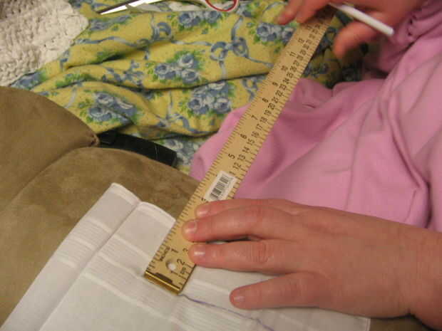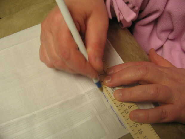 Si está atando tuyo: Mida desde el borde exterior cerca de 1 1/4-1 1/2 pulgadas. Esto es preferencia personal. He encontrado un poco más fácil de atar porque te da más espacio 1 1/2 pulgada. Hacer marcas en el borde como medida en después trace una línea a lo largo del material en ambos lados.