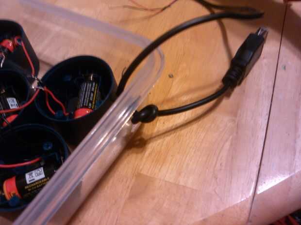 Penetra un agujero en el lado del extremo del envase. Después de anudar y alimentación de la línea del USB a través del lado até otro nudo para asegurar algo.