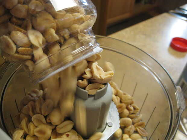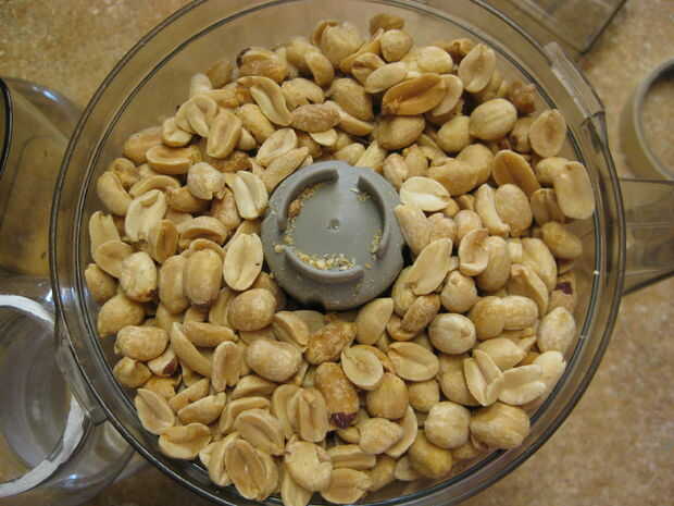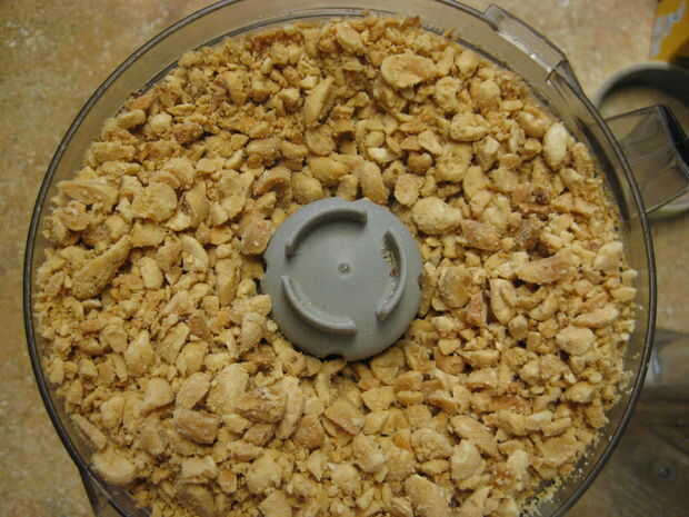 Añadir los cacahuetes a su procesador de alimentos. El procesador del pulso 30 veces. Los cacahuetes pulsados deben parecerse a la tercera imagen.