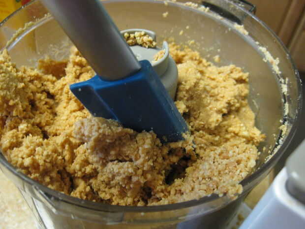 Procesar los cacahuetes durante 30 segundos más y raspar los lados del procesador después de ese tiempo. Los cacahuetes deberían verse algo como la primera foto.