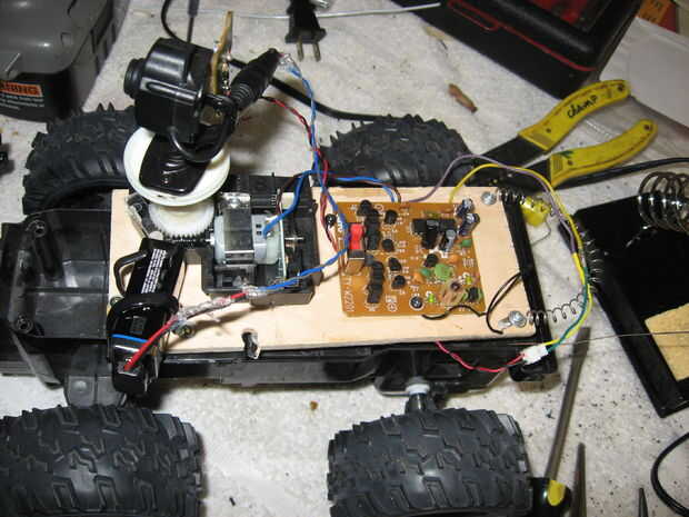 La parte más difícil del proyecto fue el coche sí mismo. Controladores pueden ser cableados en paralelo y atornillados a una tabla. Un montón de piezas de coche RC no puede. En mi primer modelo, la electrónica de la cámara tenía una "armadura" hecha de plexiglás pegado en caliente y una batería que funcionó solo la montura de la cámara. Era mudo. El coche ya tenía una batería pack en él, y me ata con correa otro en la parte superior. Esto llevó a mi decisión de poner todos en paralelo. (Decisión GOOOOOD.) Esto salvó un montón de tiempo, espacio y peso. Estos cables han sido empalmados y cortar y soldar varias veces, en un esfuerzo por crear el mejor arreglo y diseño dentro de mi presupuesto (también conocido como dinero para la cámara y el receptor). He quitado el plástico superior del moldeado del coche y velcro del giradiscos en. Mediante la eliminación de la placa giratoria, puedo acceder a electrónica y el motor del coche. También puedo usar el coche como un coche RC normal por sacar el tocadiscos - pero eso es contraproducente para la diversión de una cámara!