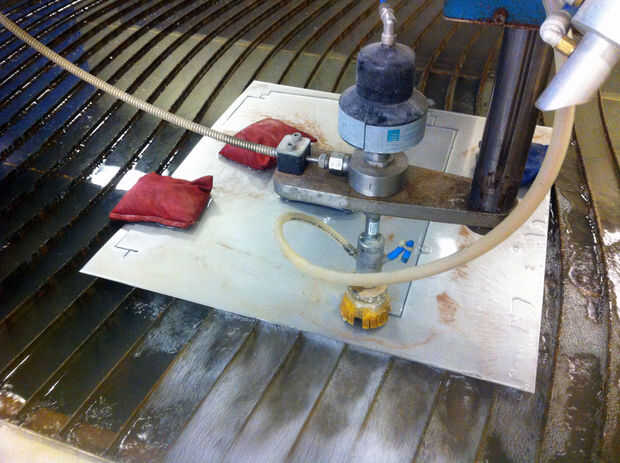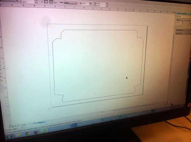 Empezó con el diseño de la caja con las herramientas del Metal de hoja de AutoDesk Inventor 2012. Cuando estaba satisfecho con el diseño, exportado el patrón plano como un DXF, que solía ejecutar la FlowJet. (Esta foto muestra que una versión temprana del DXF abrió en Corel Draw).
