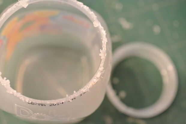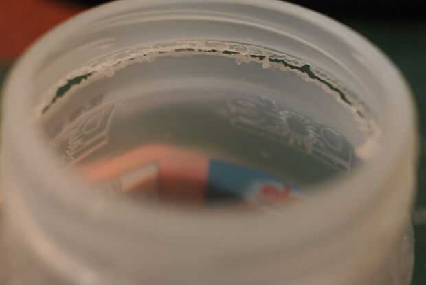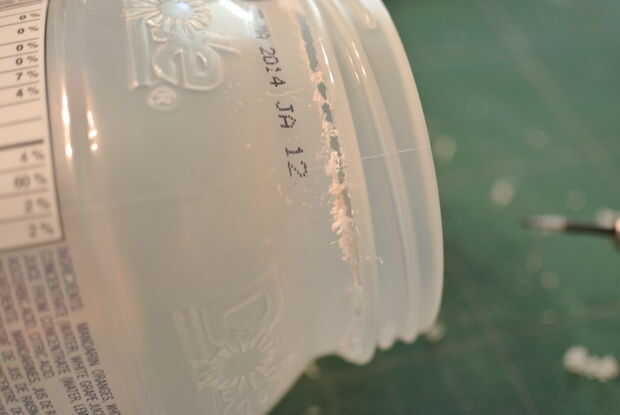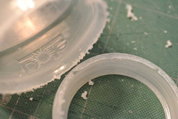 Mientras que corte la jarra con la Dremel, algunos del plástico fundido detrás juntos, así que solía el cuchillo X-acto para romper los bits restantes.