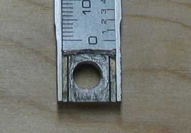 Ahora, hacer un agujero en el extremo (quijada) de la viga. Esto podría ser un problema ya que es probable que está templado. Puede utilizar un poco de la especialidad o con un poco de tiempo extra se puede utilizar un extremo de la bola pulido de piedra. Tardara un rato pero finalmente conseguirá a través. Te darás cuenta que corte la pieza de inserción de escala. Me preocupaba dañarlo cuando me estaba haciendo el agujero. Es probablemente mejor dejarlo porque la tuerca de 1/4" que pasará allí estará enganchada en los lados y no puede girar libremente. Cuando lo tomé todo aparte para documentar este proyecto ajustaron una arandela en la brecha.