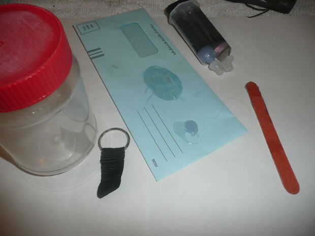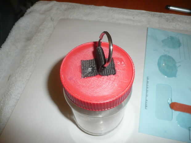 En el primer recipiente impermeable hace corte una sección de media pulgada de un tubo de pluma de punto pelota barato y ajustaron a la parte superior de la tapa y había atado un cordón corto.