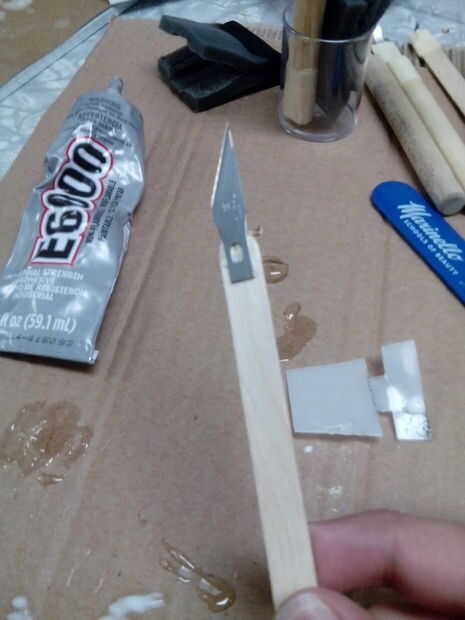 Haz un último palito y su cuchilla X-ACTO. Simplemente pegue la lámina al palito y cubrir con cinta de enmascarar. Después, de nuevo, cubrir con pasta mache.