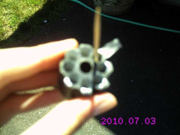 Inserte las tiras de cinta de conducto en los orificios y presionar contra la parte con el palillo. Corte la cinta extra que se pega fuera del agujero. ** Este paso puede omitirse, pero sus balas no se queda en el arma si inclina ti **