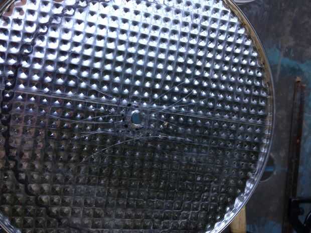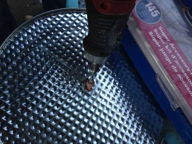 2. Encuentre el centro de la bandeja de la torta. Utilizando un compás, el punto del palillo en el borde y utilizar una herramienta de trazado (o taladro de broca, o lápiz, o...) para marca y el arco. Ahora mover el punto a otro punto de la circunferencia del círculo. Hacer otro arco. Repetir dos veces más. Definirá donde el centro es donde se superponen los arcos. Ahora apretar sus arcos haciendo el ángulo de compás más grande o más pequeño y repetición. Finalmente vas a tener una forma # apretado que define el centro del círculo. Poner allí su agujero.