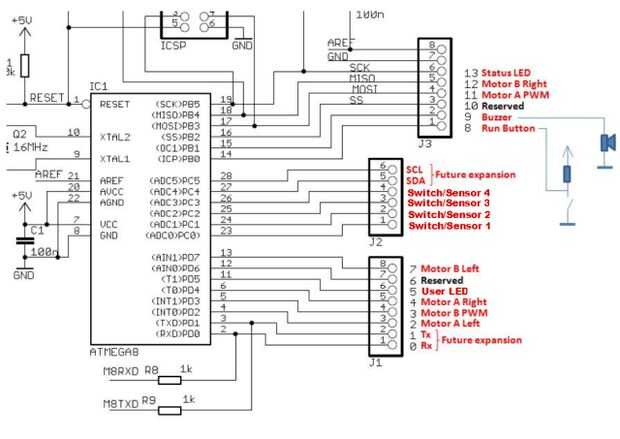 Babuino define ciertos pines de Arduino para realizar ciertas funciones. Estos incluyen controles para dos motores DC, cuatro entradas de interruptor o sensor, un beeper, un puerto serial (el puerto serie de Arduino) para hablar a un pc (Linux, Mac o Windows), un botón de ejecutar (supongo que lo que hace), un Led de usuario y un Led de estado. Sólo los recursos necesarios para un pequeño robot! Se muestra el diagrama de conexión. Necesitará añadir el botón ejecutar, el Led de estado y la alarma a tu Arduino para hacerlo en un Babuino. En el Instructable continuación, voy a explicar más sobre esto (es bastante simple). También le mostraré cómo crear una interfaz para motores de C.C. (más complejo). Si tienes un mínimo Arduino con ningún conector, conectar recursos de Babuino a los pines del procesador como se muestra. De lo contrario, puede usar los conectores estándar de Arduino.