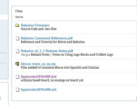 Descargar Babuino en el Foro de soporte . Necesita inscribirse (gratis, fácil; y si tienes una cuenta de Yahoo, ya está medio camino), entonces usted puede acceder a la página de archivos. La figura de la página de archivos muestra los archivos para descargar. Obtener la referencia de comandos que es un manual completo para el uso de Blocos (que podrá descargar en la siguiente sección) de Babuino. Haga clic en el Firmware para ir a la página con el código - la página de Firmware también se muestra aquí. Haga clic derecho sobre el último archivo .hex y guárdelo en un lugar adecuado. Esto es lo que subiré a tu Arduino.