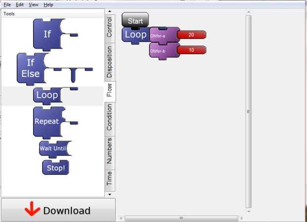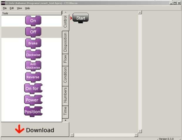 Crear el programa que acabamos de describir. Mira la otra figura para más detalles sobre el entorno de Blocos. Simplemente haga clic en un componente en el panel de bloques, mueve el cursor en el panel del programa, y el componente aparecerá bajo el cursor. Haga clic de nuevo para dejarlo caer y utilizar el panel definir para establecer los parámetros. Haga clic en las pestañas para seleccionar diferentes conjuntos de bloques de programa. Los bloques se encajan entre sí para crear el programa. Si usted tiene cualesquiera problemas, lea la referencia de comandos ya descargado.
