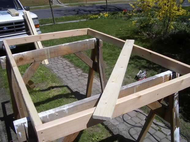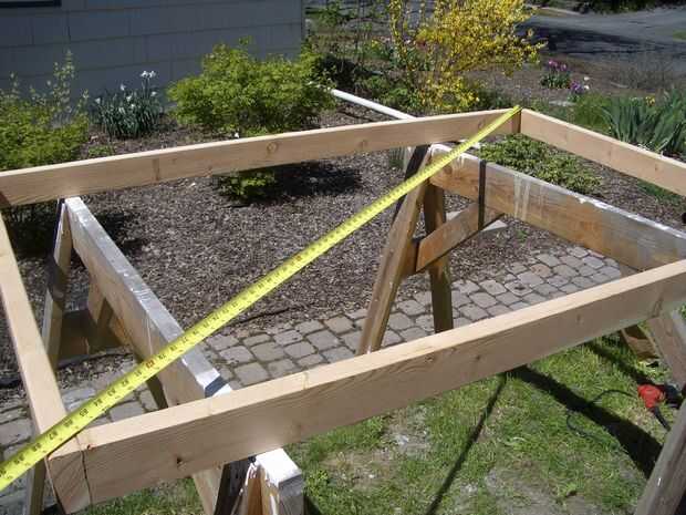 Montar el cuadro de 2 x 4, con los 3" tornillos para sujetar el 2x4s más corto a la 2x4s más largo,"tapado"los extremos de la más larga 2x4s (consulte el diagrama). No te preocupes demasiado por mantener la Plaza marco, sólo aspirar los tornillos firmemente. Una vez tengas el marco montado, medir diagonalmente de esquina a esquina en el marco. Empuje y jale el marco, comprobar las mediciones con frecuencia, hasta que las medidas son las mismas (aproximadamente 88-3/16" en este caso). Cuando están, el marco es cuadrado. Sí, lo sé, podría ser un trapezoide, pero si sus componentes son razonables cerca de la longitud correcta, va a ser bastante cuadrado. Este es uno de los procesos utilizados para encuadrar cualquier cosa más grande que su dispositivo escuadra confiable más grande, de las fundaciones a windows, y no matemáticas se requiere. Utilice uno de los listones de 1 x 4 de 4' - 7" conectado con dos tornillos de 2" a través de una de las esquinas del marco para mantener cuadrado temporalmente.
