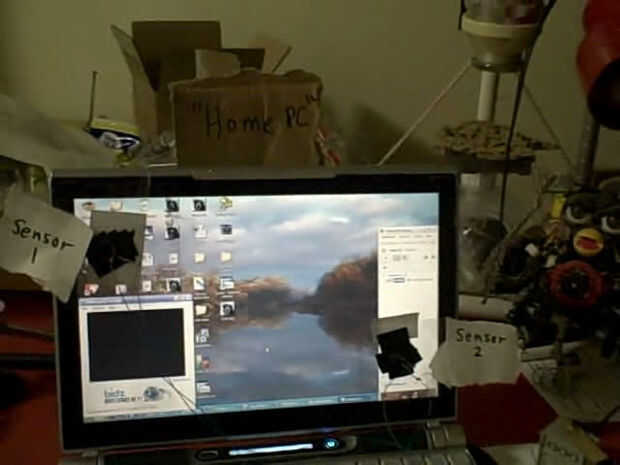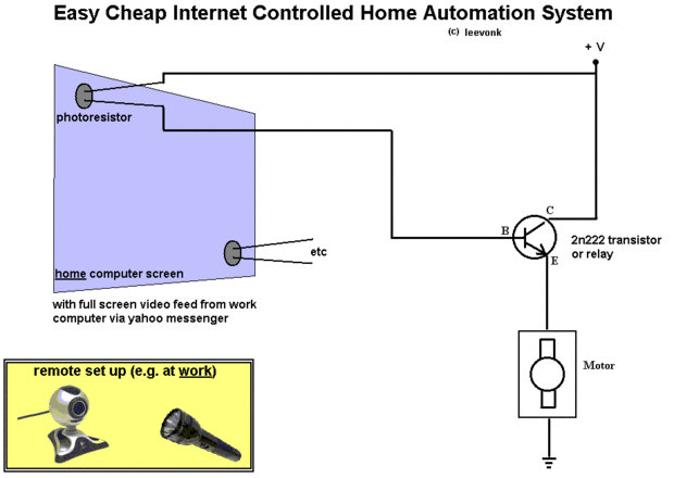 Este sistema permite el control remoto (vía internet) de actuadores (motores, etc) en su casa. Funciona detectando cambios de brillo en particular lugares en la pantalla del ordenador de casa (lugares en que están grabados los sensores). Estos cambios de brillo son controlados remotamente por usted a través de yahoo messenger webcam video alimentación entre su equipo de trabajo y el ordenador de casa.