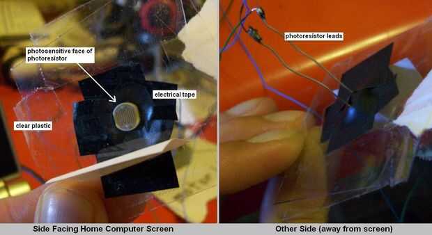 (4) fotorresistores cinta para la pantalla de tu ordenador de casa. Lo hice primero grabar los fotorresistores a una pieza transparente de plástico con cinta aislante negra, y luego grabar el plástico a la pantalla con cinta scotch. (segunda imagen)